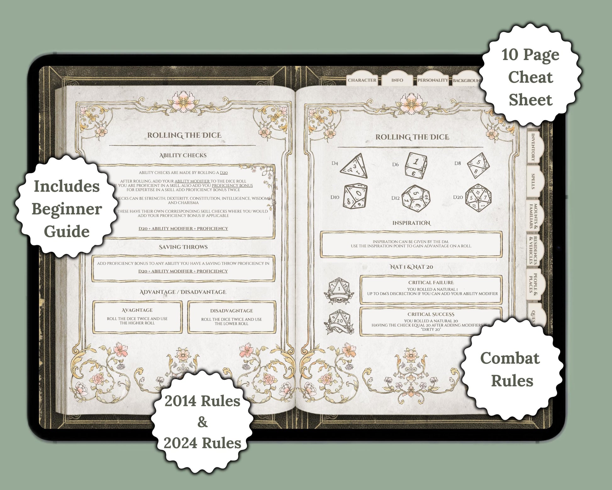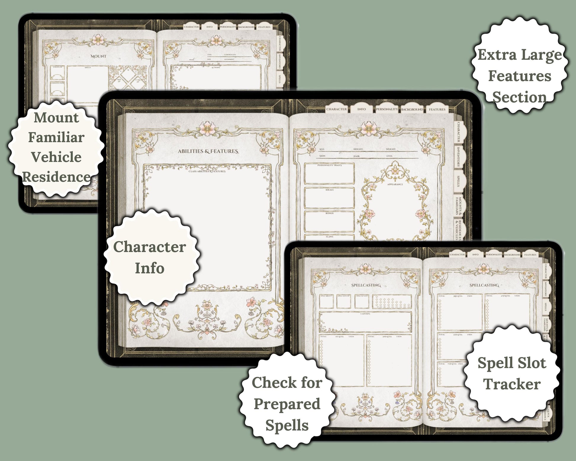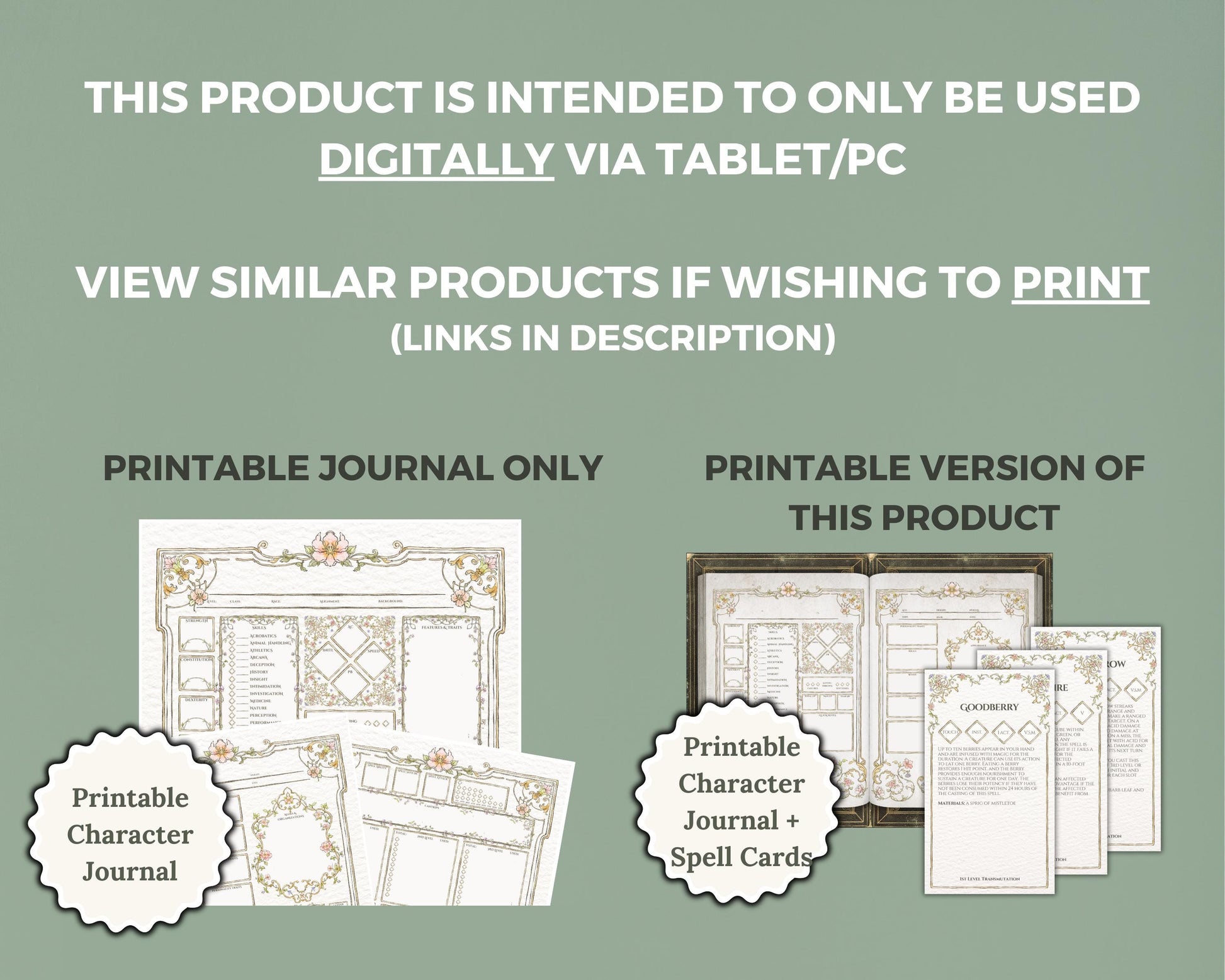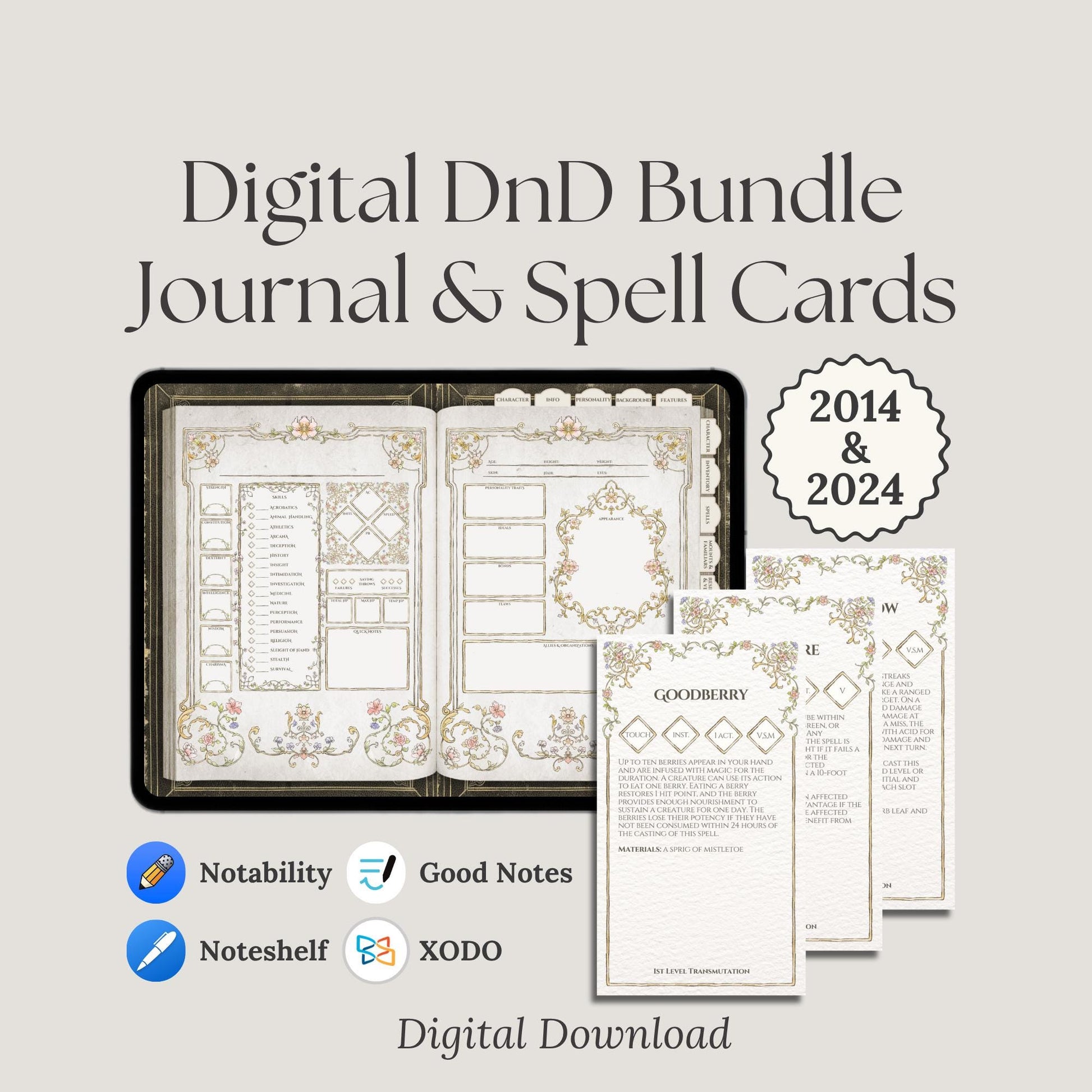 Introducing the Floral Digital Character Journal & Spell Cards Bundle—the ultimate digital resource for Dungeons & Dragons players, designed to bring seamless functionality to your DnD campaign. This bundle combines a fully hyperlinked, form-fillable character journal with a comprehensive set of spell cards, making it the perfect tool for managing both your character details and spellcasting with ease.