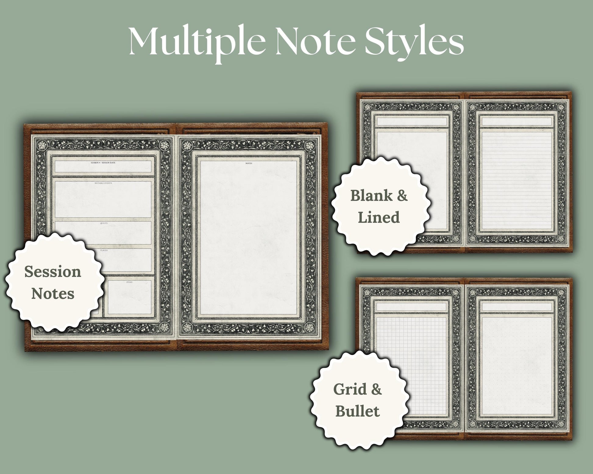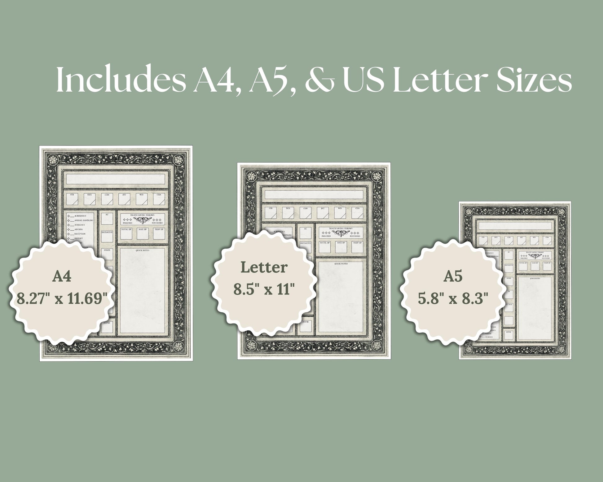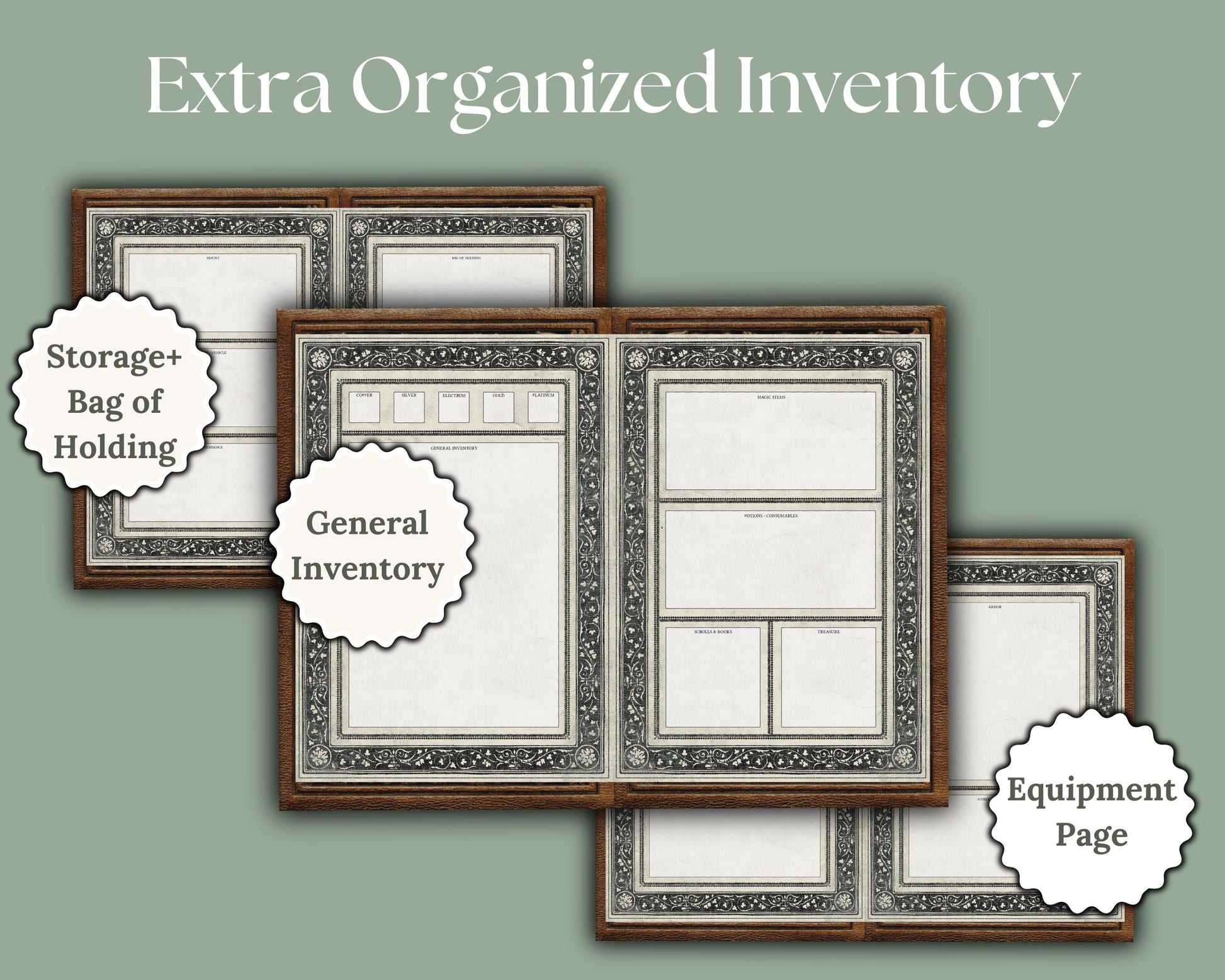 -36 unique pages designed for D&D, including space for character stats, mounts, familiars, vehicles, residences, and more.