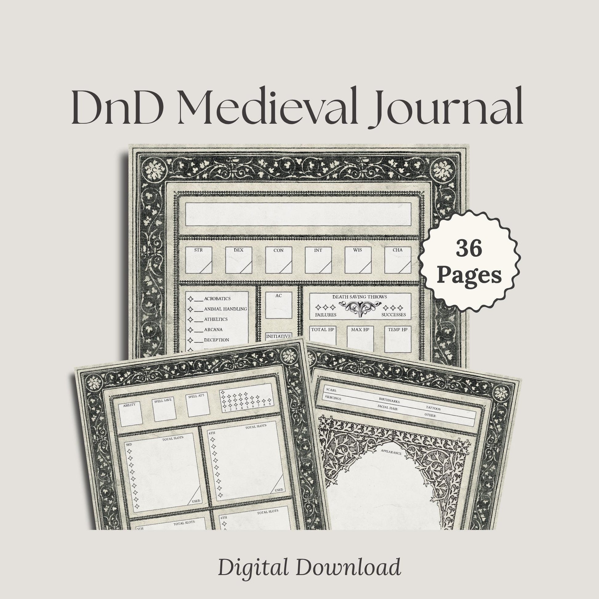 Introducing the Gothic Printable DnD Character Journal—a digital, medieval-themed notebook designed for Dungeons & Dragons players. Perfect for enhancing your DnD campaign, it offers comprehensive tracking for all your character details.