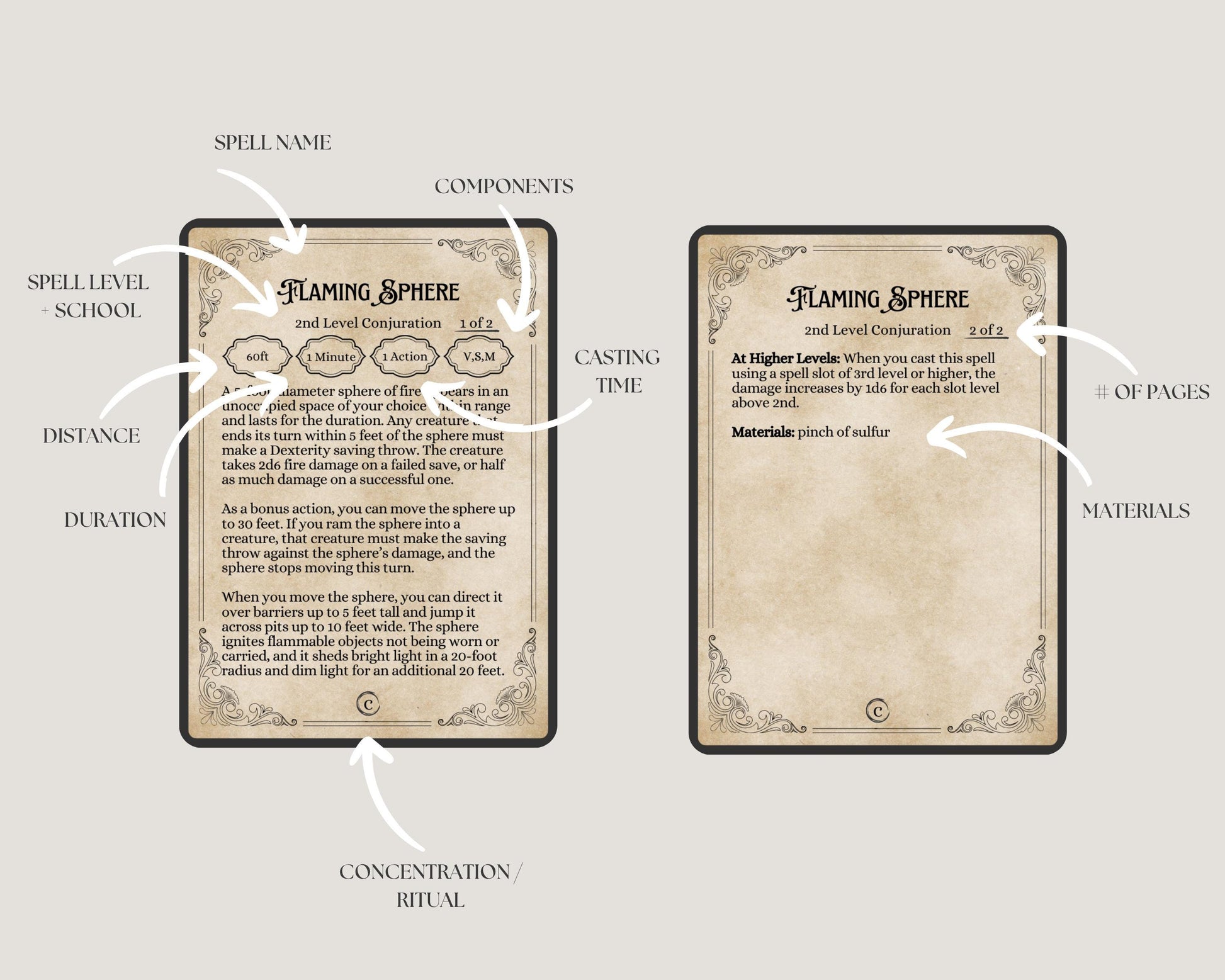 -4x6" & A4 Ornate spell cards crafted in antique scroll style, featuring all D&D 5e SRD spells. Never miss a detail with these large-format cards designed to include every word of even the longest spells.
